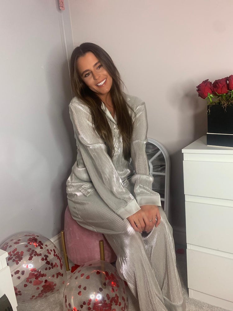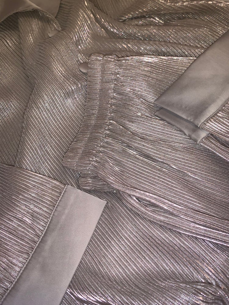 Highlights: silver glitter pleated material, lightweight satin, elasticated waist band, front button fastening, beautiful silk cuffs.