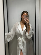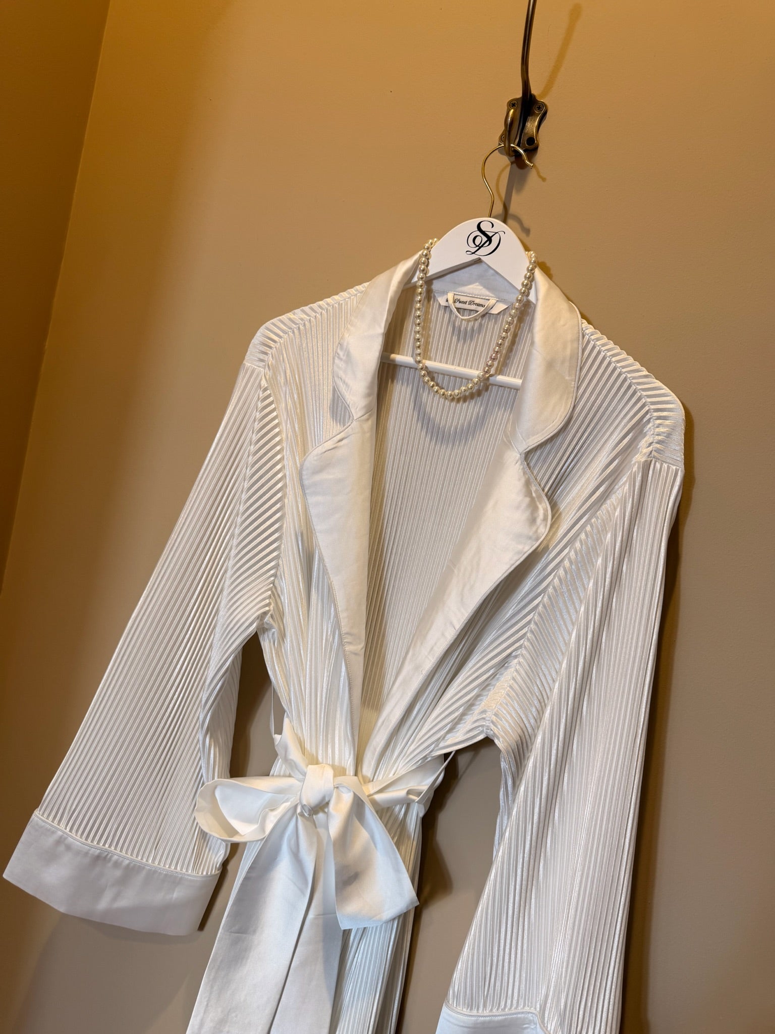 Our white plissé floor-length robe is designed to perfectly complement our original plissé pyjamas. Crafted in the same softly textured fabric, it features long sleeves, a flattering tie-waist belt, and an inner tie fastening to ensure a secure, comfortable fit.